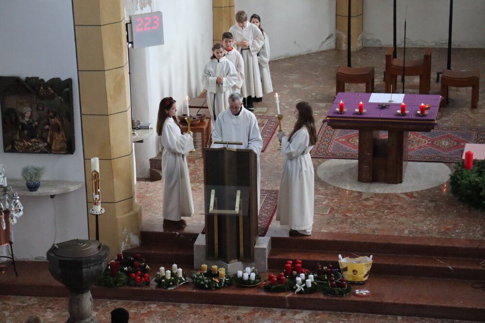 Zünd ein Licht an für die Gerechtigkeit - Ein Licht ist stärker … Zünd ein Licht an ….“ Dieses Lied von Kurt Mikula eröffnet den Familiengottesdienst und die Adventkranzsegnung mit Pfarrkurator Bruno. Viele, besonders Kinder, sind eingebunden. Die „Sprache des Adventkranzes“ ermuntert, viele Lichter anzuzünden: Wenn ihr jemanden eine Freude macht, entzündet ihr ein Licht in seinem Herzen. „Wir sind berufen, Licht zu sein“ – so die Aussage im Gespräch zwischen Zündholz und Kerze.