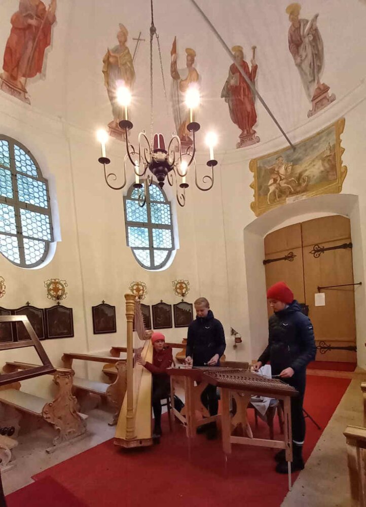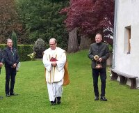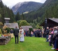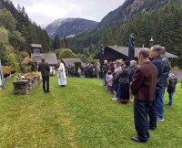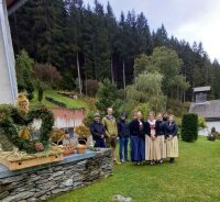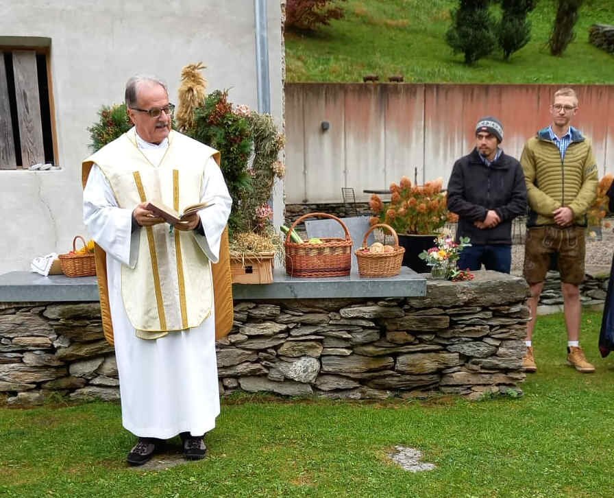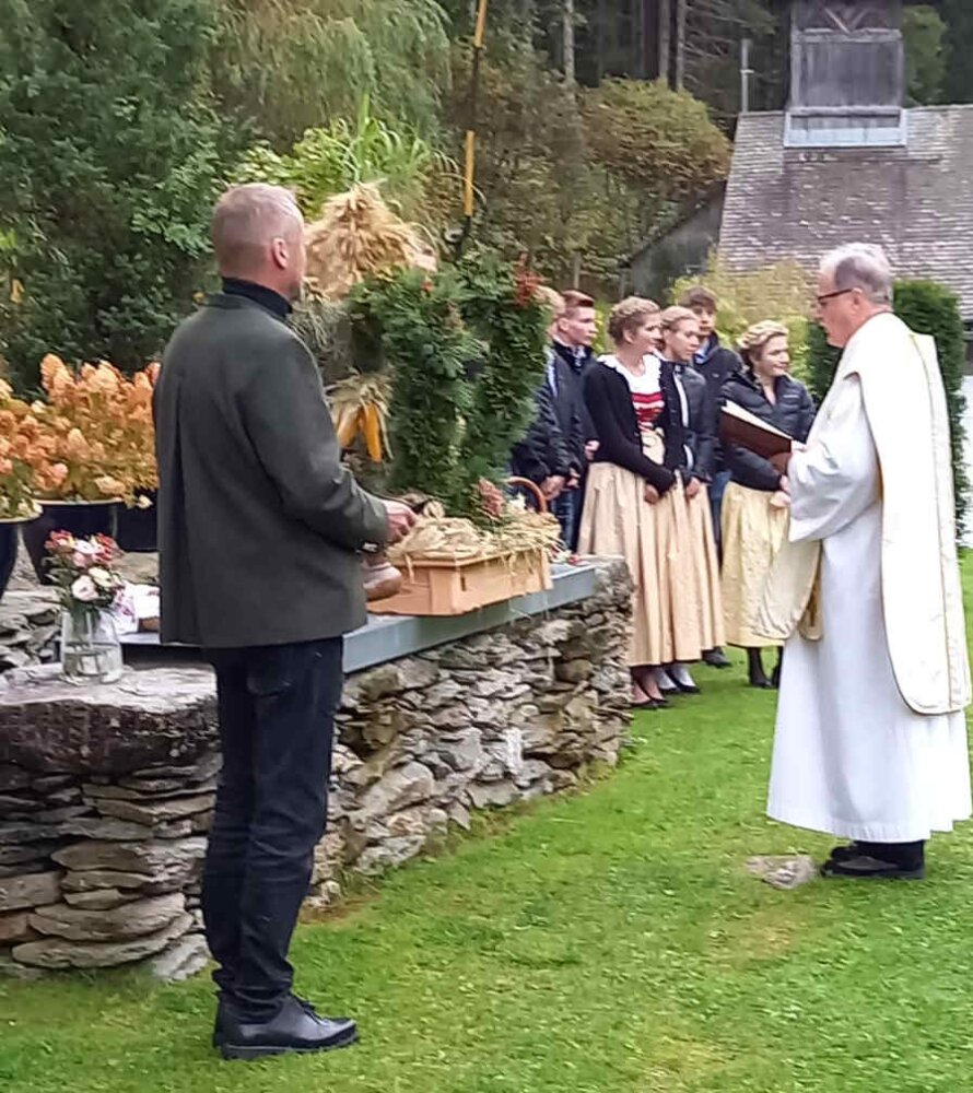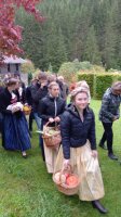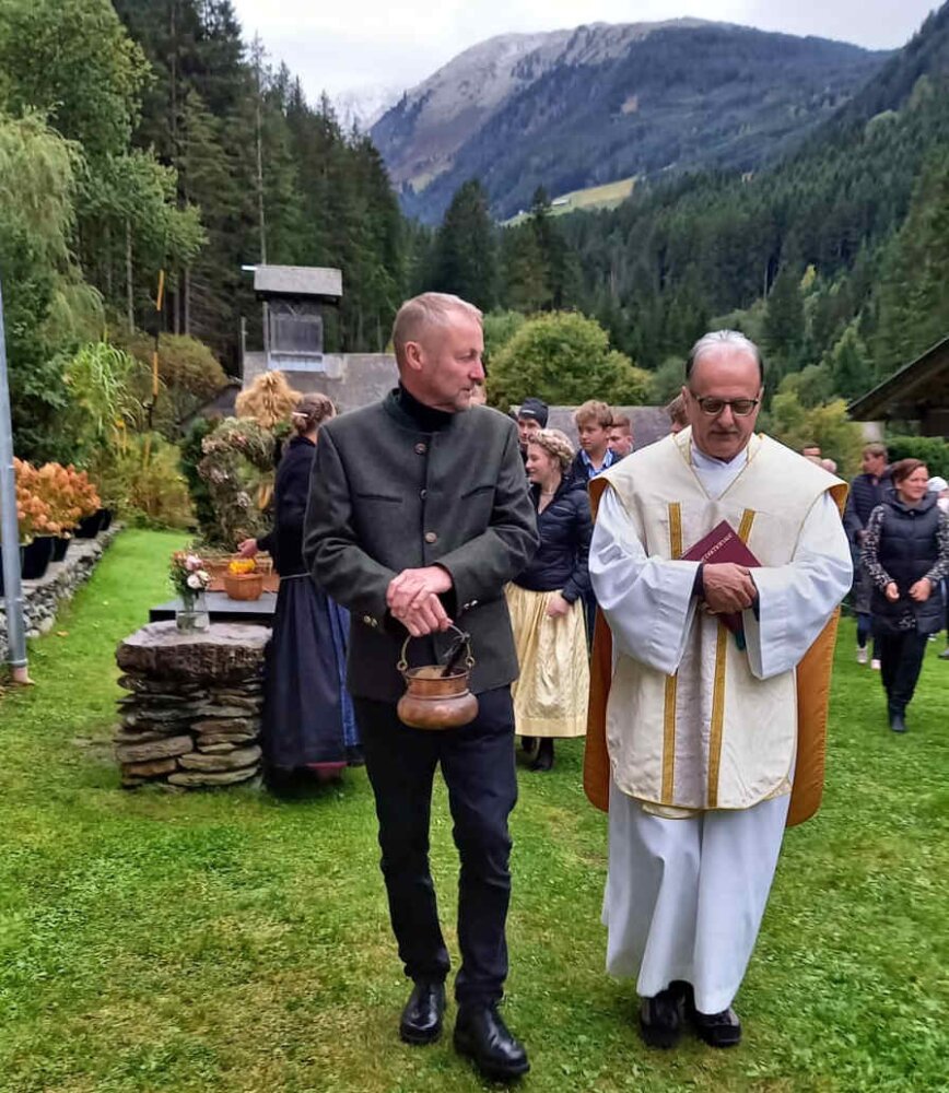 Pfr. Josef Scheiring, Kirchenrektor von St. Karl, segnet die Erntedankkrone der Jungbauernschaft/Landjugend Großvolderberg und zieht mit vielen Festbesuchern zum Erntedankgottesdienst in die Volderwildbadkapelle ein. Die Innsaitigen umrahmen mit Hackbrettern und einer Harfe das Fest qualitätsvoll.