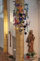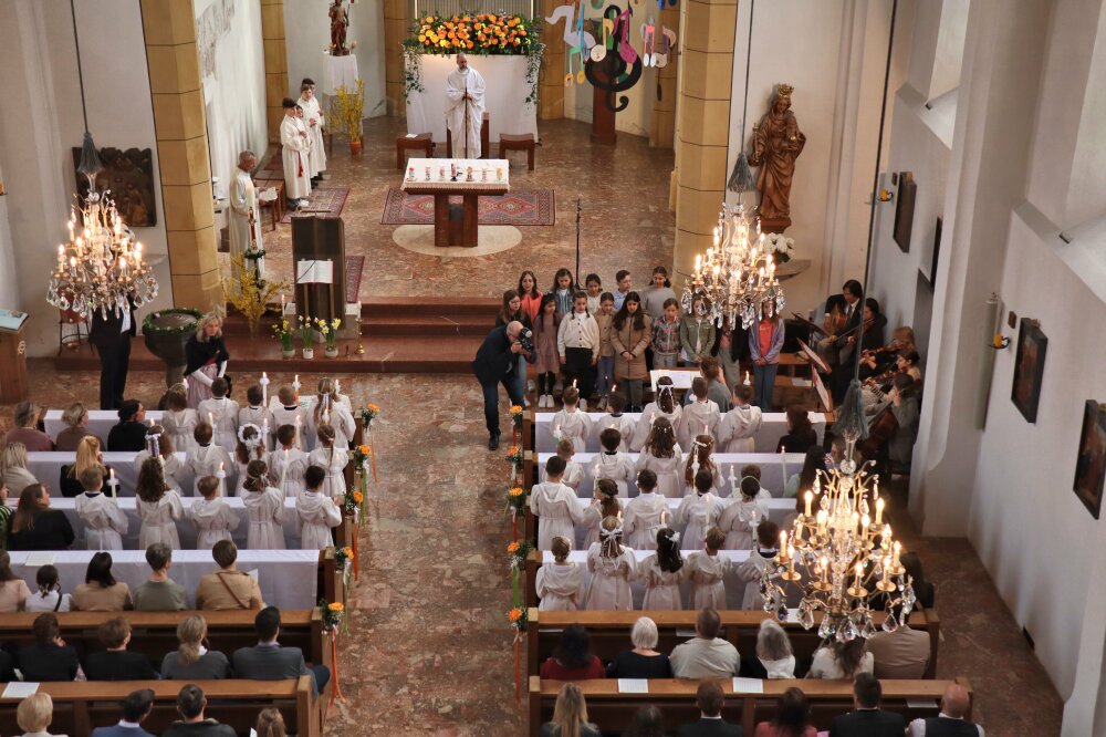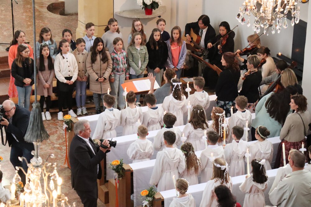 „Du bist ein Ton in Gottes Melodie. Ein schöner Ton in seiner Symphonie. Ob Dur, ob Moll, ob leise oder laut, mach dich mit Gottes Melodie vertraut.“ – so lautet das Thema der Erstkommunion 2024. Diese Noten hängen als Symbole von der Kirchendecke, die Pfarrkirche haben „fleißige Hände“ dem Anlass entsprechend festlich geschmückt.