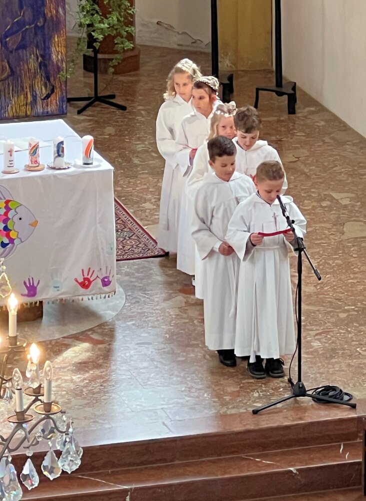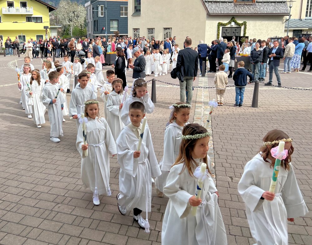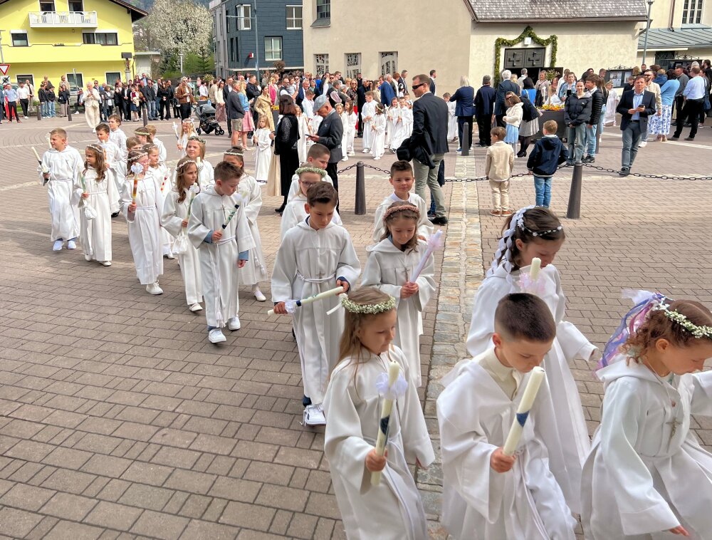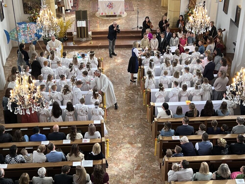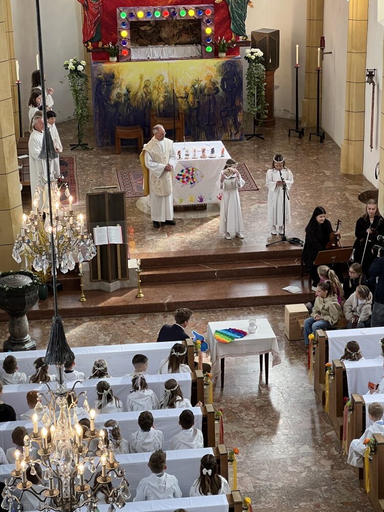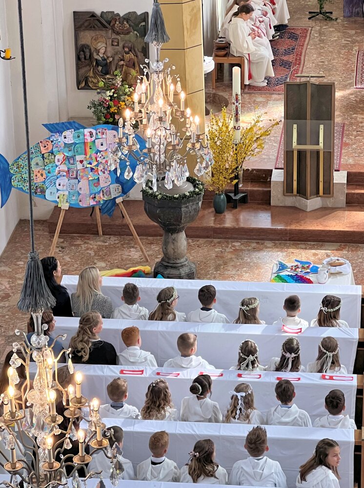 Alle, die uns wichtig sind, sind da: die Familie, die Paten, der Volksschulchor, Musikanten in der Kirche und die Musikapelle draußen, … Tischmütter und Tischvater, Direktor und Lehrerinnen. Wir 48 Kinder feiern mit Pfarrer Alois, Pfarrkurator Bruno und Jesus – der ist immer da, auch im Symbol des Fisches und des Regenbogens.