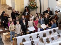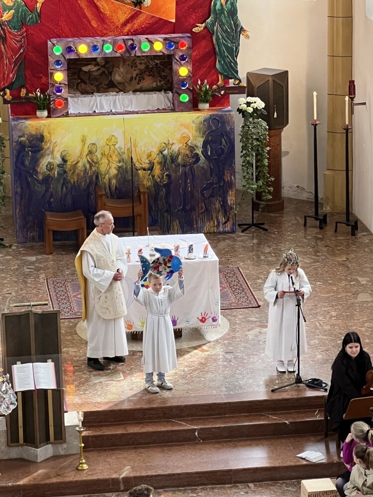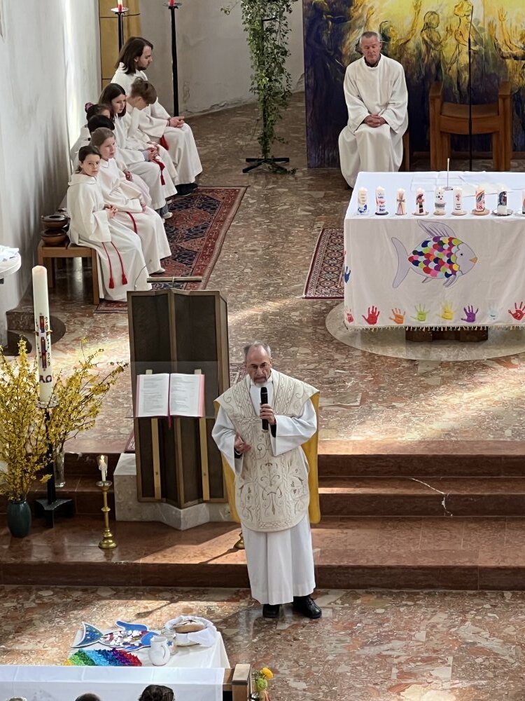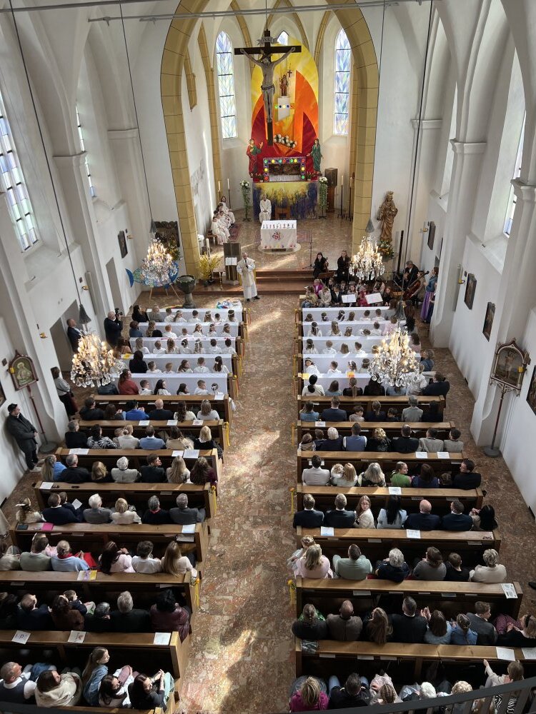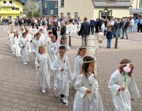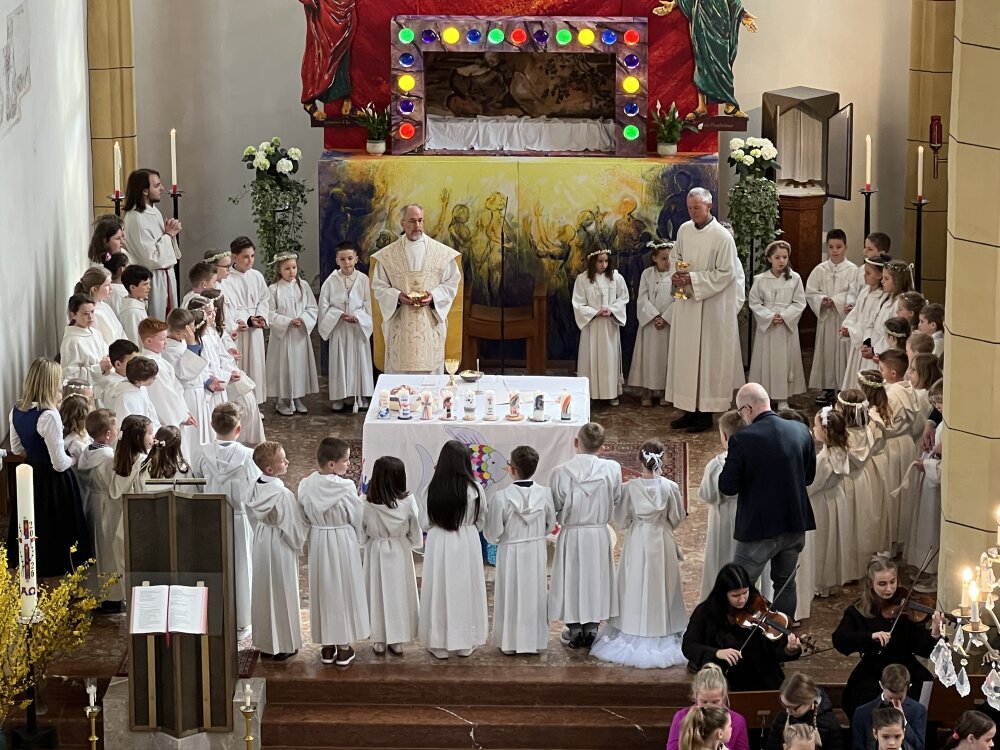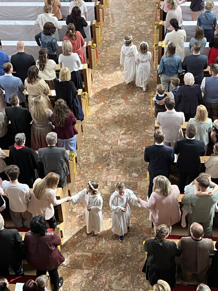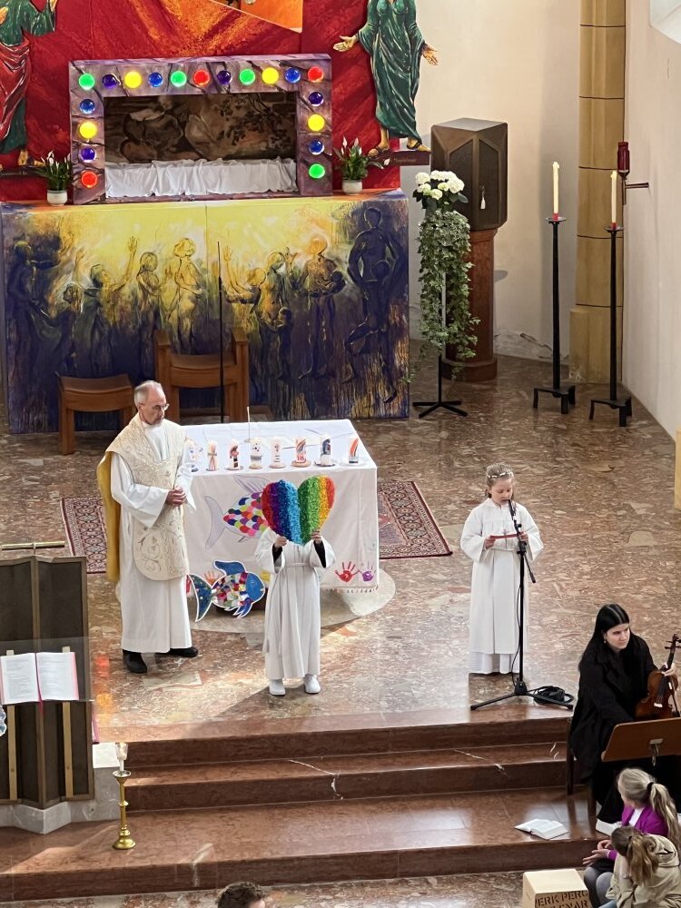 Alle, die uns wichtig sind, sind da: die Familie, die Paten, der Volksschulchor, Musikanten in der Kirche und die Musikapelle draußen, … Tischmütter und Tischvater, Direktor und Lehrerinnen. Wir 48 Kinder feiern mit Pfarrer Alois, Pfarrkurator Bruno und Jesus – der ist immer da, auch im Symbol des Fisches und des Regenbogens.