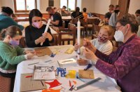 Kinder gestalten mit ihren Paten die Erstkommunion-Kerze