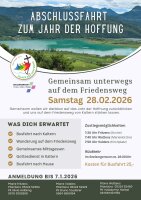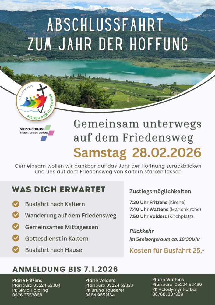 So wollen wir von unserem Seelsorgeraum aus zum Abschluss des heiligen Jahres „Pilger der Hoffnung“ den Friedensweg in Kaltern gemeinsam gehen (Gehzeit ca. 2 Stunden) und zwar am Sa 22. Feber. Treffpunkt ist um 7:30 Uhr bei der jeweiligen Pfarrkirche, von wo aus wir gemeinsam mit einem Bus nach Kaltern fahren. Dort werden wir den Friedensweg über Altenburg gehen und gemeinsam Gottesdienst feiern. Nach einem guten Mittagessen und dem Besuch des Hl. Antonius von Kaltern werden wir so ca. 16:30 Uhr die Heimreise antreten. Die Kosten für den Bus belaufen sich mit Unterstützung des Seelsorgeraumes auf € 25-.