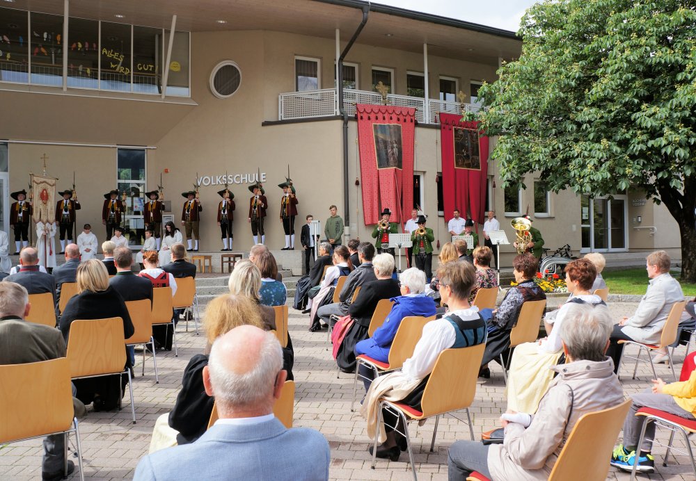 Festmesse am Kirchplatz, Abstand zwischen den Gläubigen, Fahnenabordnungen, Umrahmung durch Bläser – aber trotz der Einfachheit wegen der Corona-Beschränkungen ein würdiges Fronleichnamsfest! Danke allen, die vorbereiten und mithelfen!