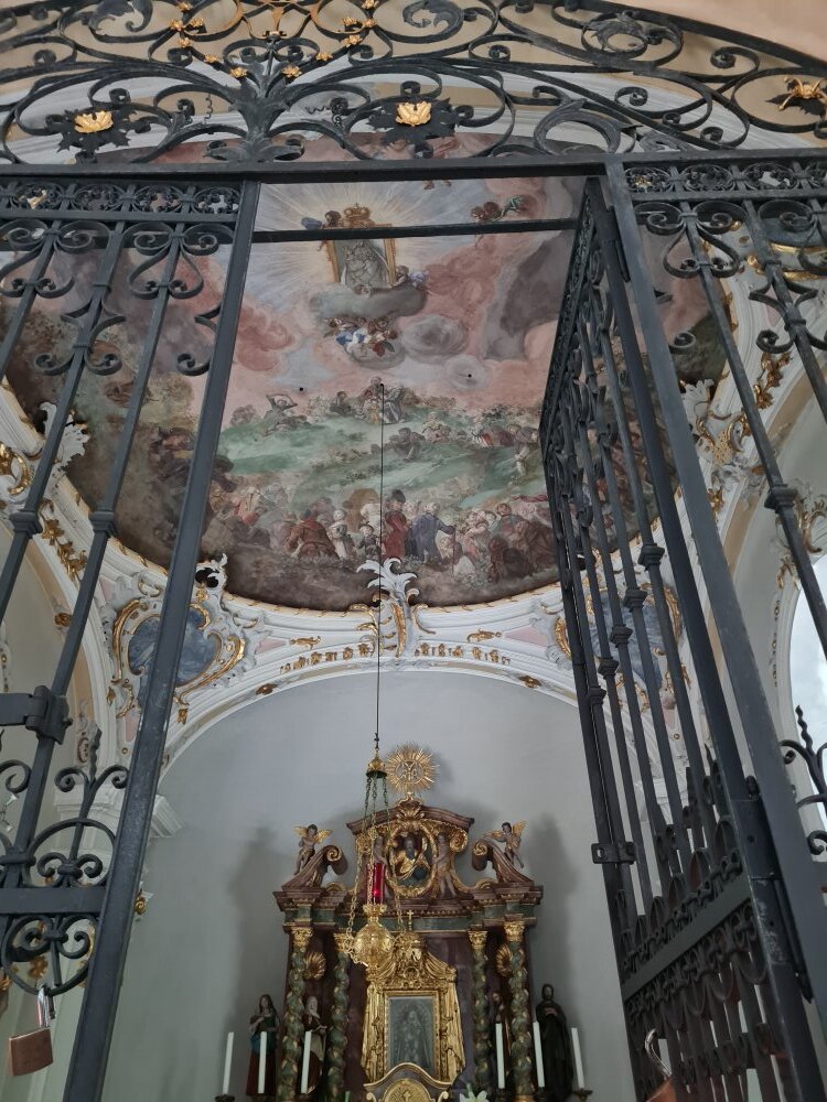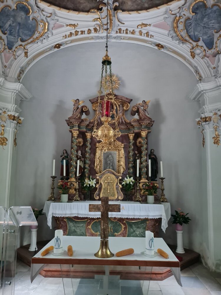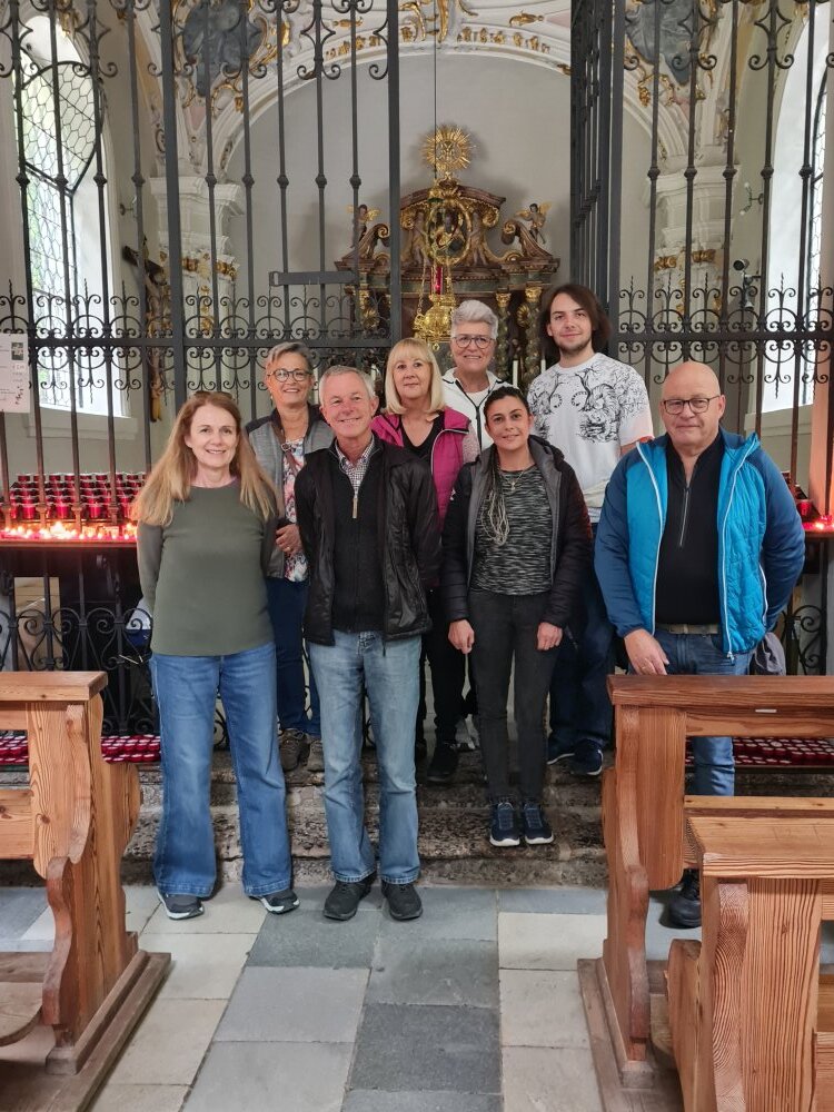 Wir hatten großes Wetterglück bei unserer Wallfahrt vom Planötzenhof zum Höttinger Bild. Bei der Andacht in der Kapelle erzählte uns Bruno, wie dieser besondere Ort entstand. Wir gedachten auch des Heiligen Franz von Assisi. Da im Anschluss die alljährliche Bäckerwallfahrt mit Bischof Hermann stattfand, war sogar das Gitter vor dem Altarraum mit dem Marienbild geöffnet.