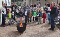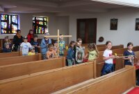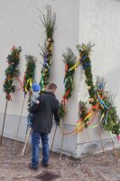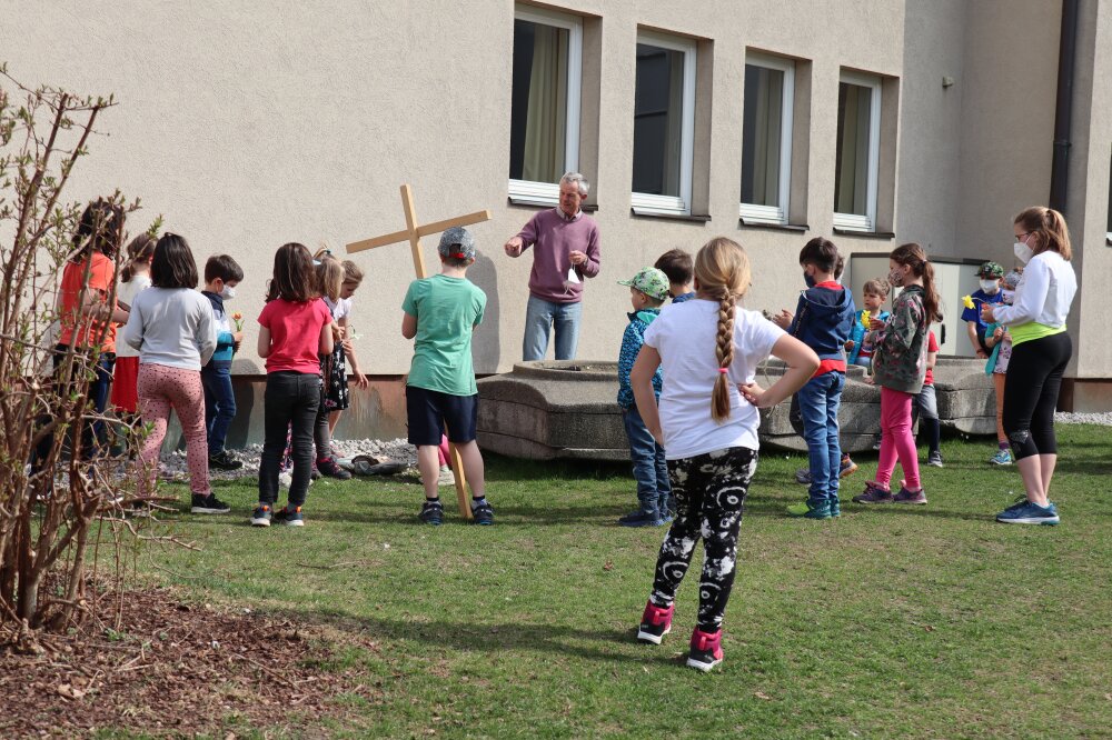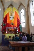 Der Osterfestkreis beginnt mit dem Aschermittwoch und erreicht seinen Höhepunkt in der Karwoche mit Palmsonntag, Osternacht und der Auferstehung Christi. Die verzierte Osterkerze weist auf den auferstandenen Jesus hin: Kreuz, darüber der erste Buchstabe A (Alpha) und darunter der letzte Buchstabe Omega des griechischen Alphabets und die Jahreszahl.