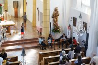 Pfarrer Sylvain und Pfarrkurator Bruno feiern mit den Familien den Muttertagsgottesdienst, den der Familienkreis vorbereitet und Minh mit seinen Musikern begleitet. Kinder überreichen den Müttern Rosen.