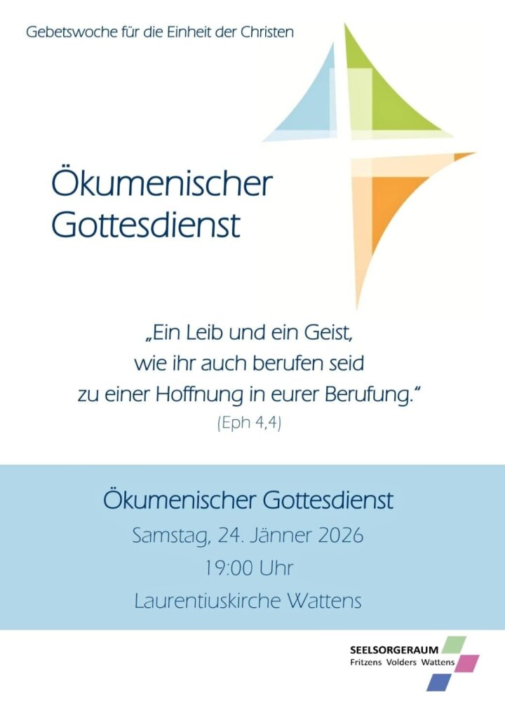Jedes Jahr zur Gebetswoche um die Einheit der Christen feiern wir christliche Kirchen in unseren Seelsorgeraum zusammen einen ökumenischen Gottesdienst. In diesem Jahr wird er am 24. Jänner 2025 um 19,00 Uhr in der Laurentiuskirche in Wattens sein. Das Thema des heurigen Gottesdienstes lautet: „Ein Leib und ein Geist, wie ihr auch berufen seid zu einer Hoffnung in eurer Berufung.“ (Eph 4,4).